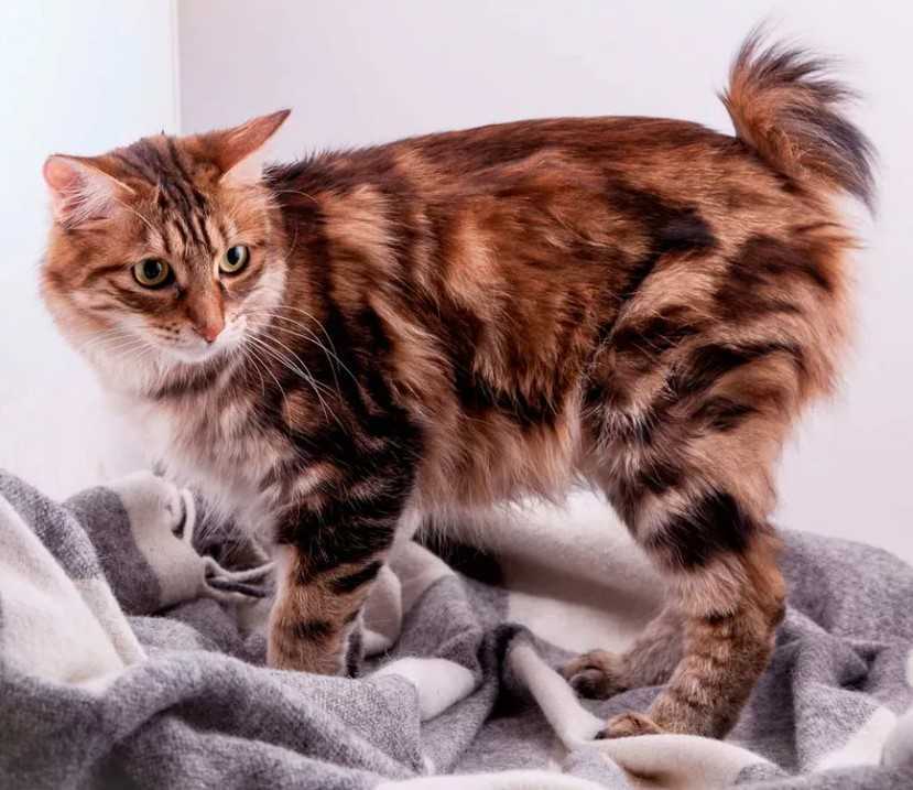 Отличительной чертой курильского бобтейла является изогнутый короткий хвост. Кошка небольшого размера, мускулистая, с четким контуром корпуса. Представители породы могут быть с короткой шерстью и полудлинной.