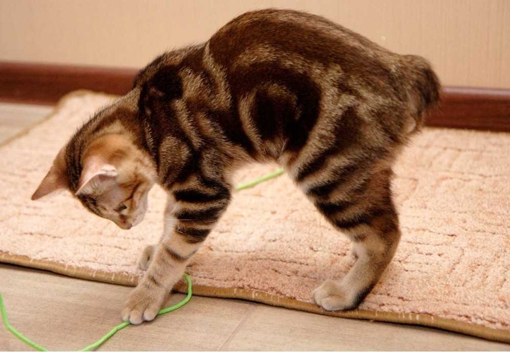 - Крепким, мускулистым и коротким корпусом со слегка выгнутой спиной и высоким крупом, чем напоминает рысь;
