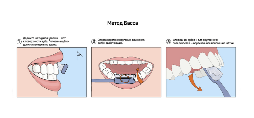 - Переднюю (губную) и заднюю (язычную) поверхности чистят выметающими движениями от десны к краю зуба, щетку держат под углом 45°