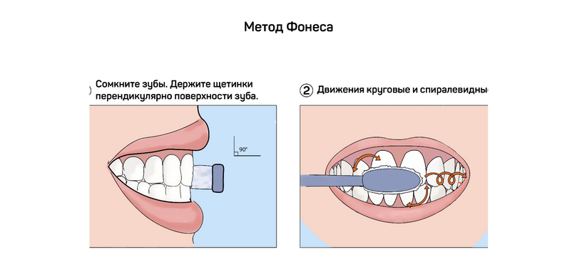 - При чистке зубов по данной методике необходимо сомкнуть зубы вместе и широко улыбнуться, передняя поверхность всех зубов чистится круговыми движениями