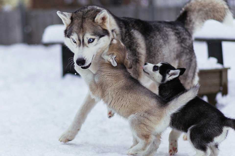 Если маленького хаски приучить к соседству с другими животными в доме, то в будущем не возникнет проблем с совместным уживанием семейных питомцев.