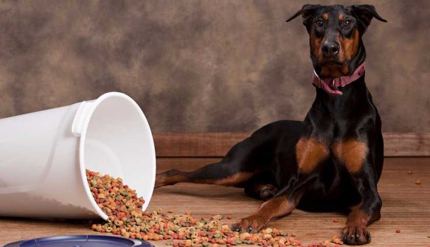 Для кормления добермана можно использовать сухие корма или натуральную пищу