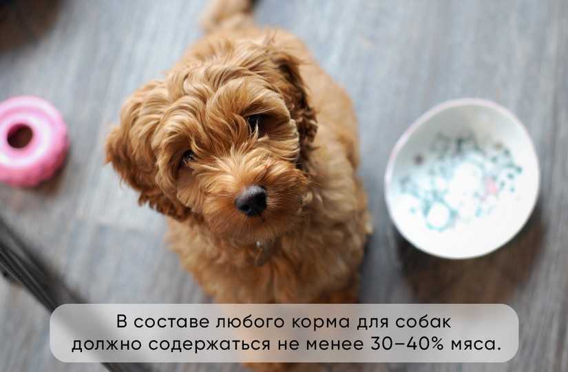 В составе любого корма для собак в первую очередь должны быть белки, необходимые для роста и восстановления тканей. В идеальном варианте количество содержащегося мяса должно составлять не менее 30–40%. Лучше всего усваиваются говядина, баранина, курица, индейка, кролик.