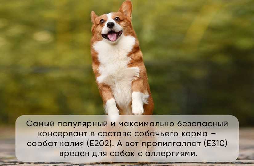 Самый популярный и максимально безвредный консервант – сорбат калия, он же Е202. Не является аллергеном, его можно добавлять в корма для беременных собак, так как он не влияет на внутриутробное развитие будущих щенков.