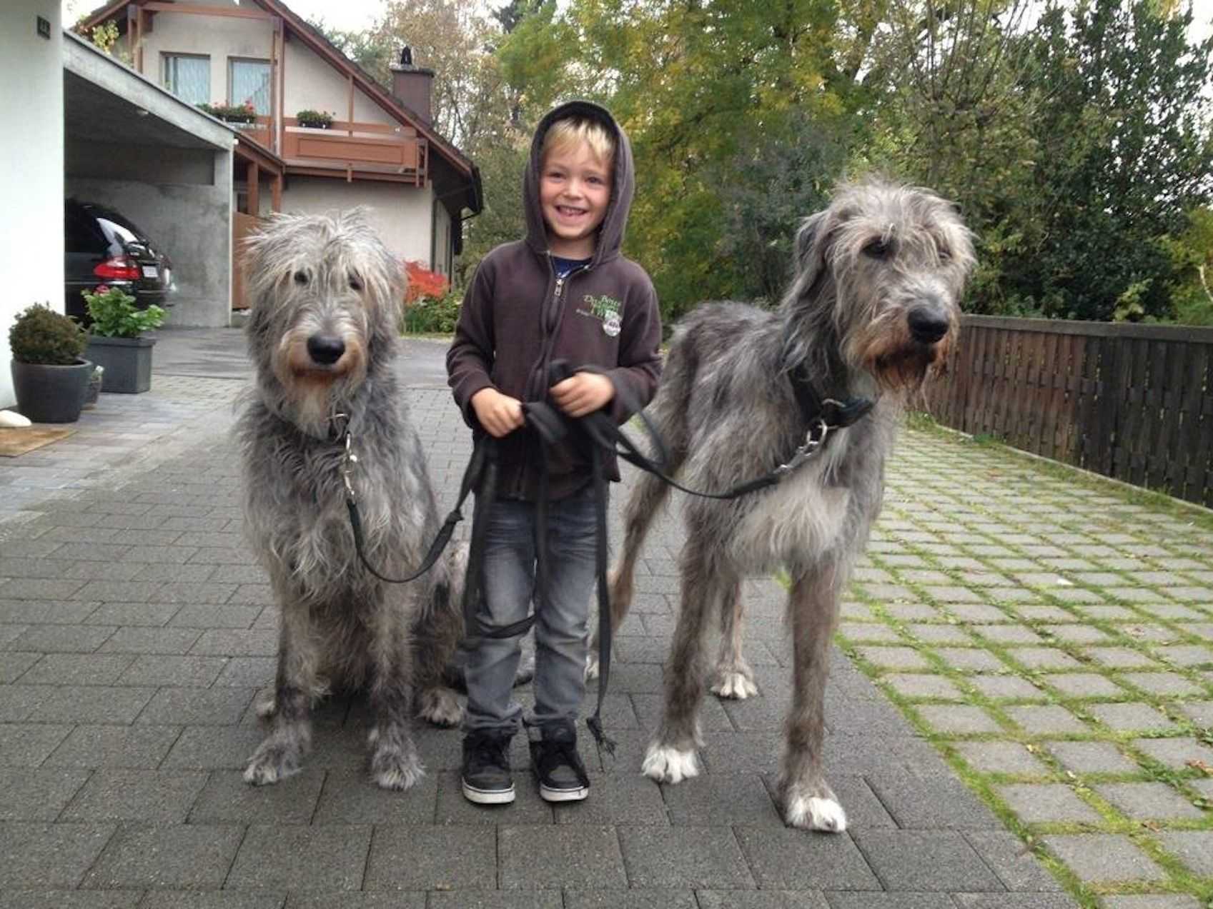 Важная особенность породы ирландский волкодав: флегматичный, ласковый питомец, который будет пятиться и стараться уйти от чрезмерно активного ребенка, приходит в настоящую ярость, если на него нападают.