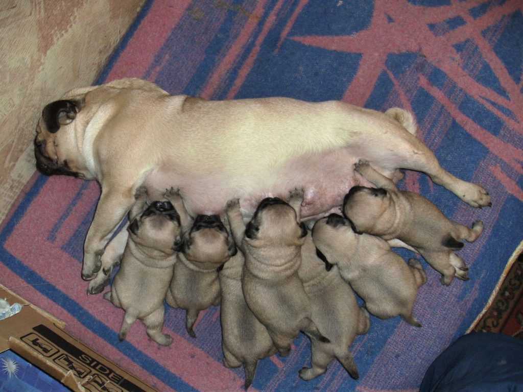 Мопсы относятся к брахицефалам – это породы с укороченной и плоской мордой. Из-за строения черепа у мопсов роды нередко бывают затруднены. Крупные щенки не могут пройти сквозь родовые пути из-за своих больших голов. Поэтому всю беременность самку необходимо держать на строгой диете. Это не означает, что ее необходимо морить голодом. Порции пищи должны быть стандартными по размеру. Меняется состав рациона: увеличивается количество белков, и уменьшается количество злаков. Самку нужно кормить часто: 5 раз в день.