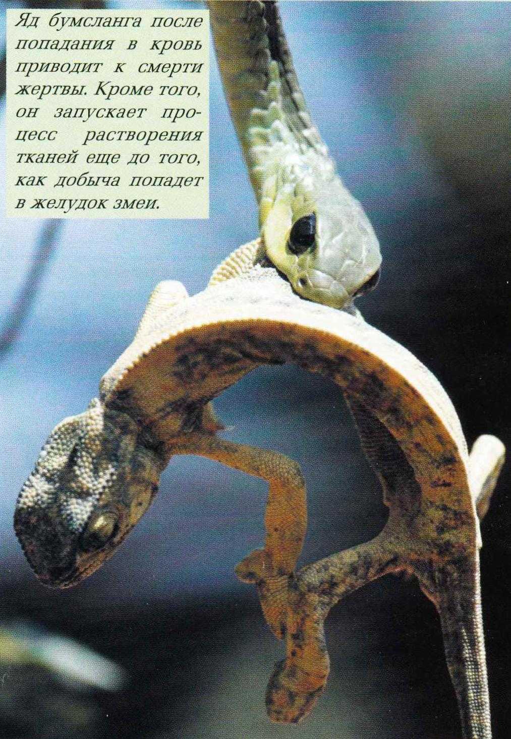Яд бумсланга после попадания в кровь приводит к смерти жертвы. Кроме того, он запускает процесс растворения тканей еще до того, как добыча попадет в желудок змеи.