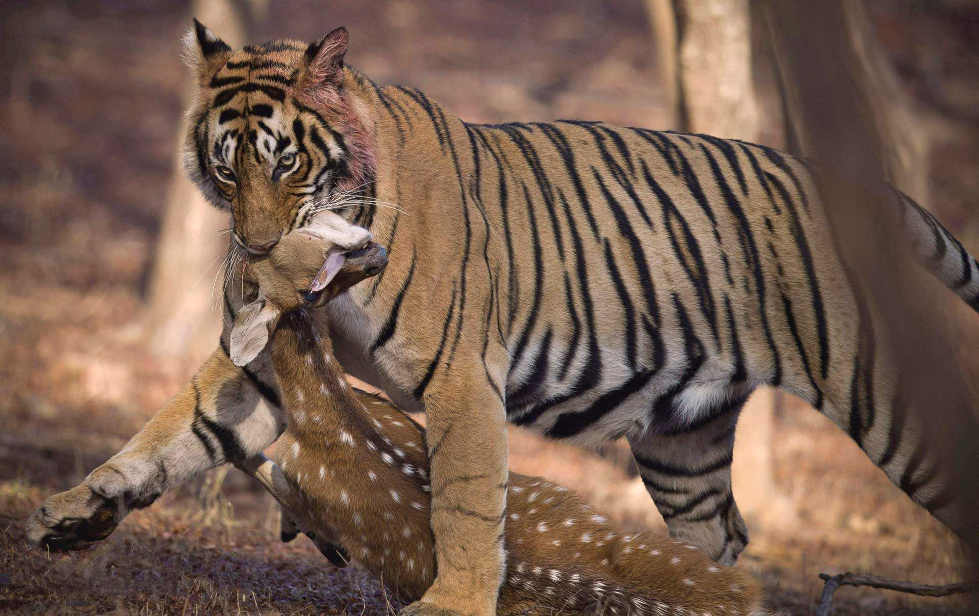Своим жертвам тигр старается впиваться в горло. Благодаря длинным клыкам, чаще всего, он перекусывает артерии, но не редки случаи и перелома шеи жертв. Более мелким животным тигр старается перебить лапы или позвоночник укусом или ударом лапы. После успешной охоты тигр старается спрятать свою добычу в безопасное место. Добычу менее 50 кг он несет в зубах, он даже способен с ней перепрыгивать преграды до 2 м. Более крупную добычу он способен забрасывать себе на спину, а особо крупных волочит по земле.