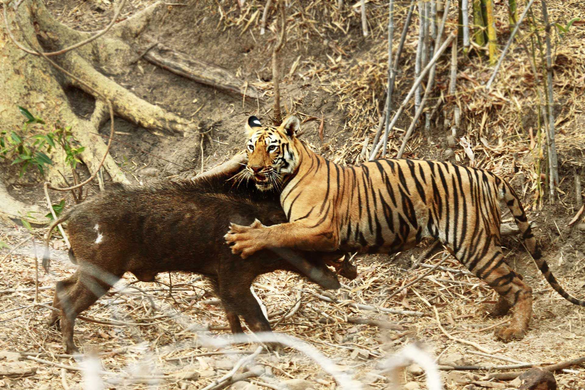 Тигр часто использует засадный способ охоты, поджидая добычу на водопое. Но может и отправиться на охоту и подкрасться к добыче самостоятельно