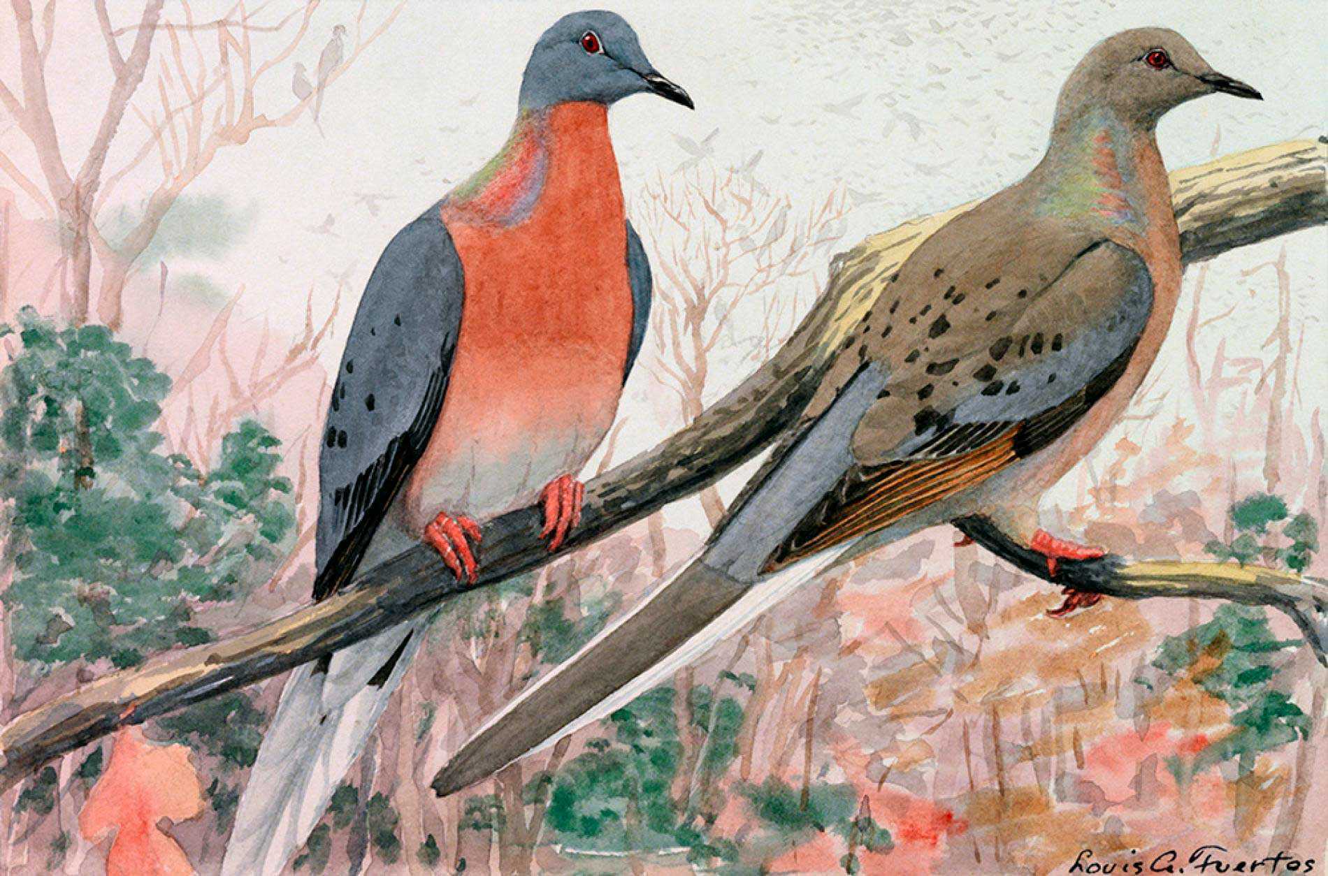 Странствующие голуби свои миграции совершали невиданными в истории стаями длиной до 500 км и исчислялись сотнями миллионов. Эта птица была самой многочисленной на континенте и насчитывала особей от 5 до 7 миллиардов. Но после массового расселения европейского населения на континенте эту птицу начали массово выбивать. В итоге в 1901 году была убита последняя дикая особь странствующего голубя, а в 1914 году умерла последняя особь содержащаяся в зоопарке и теперь этот вид считается вымершим.