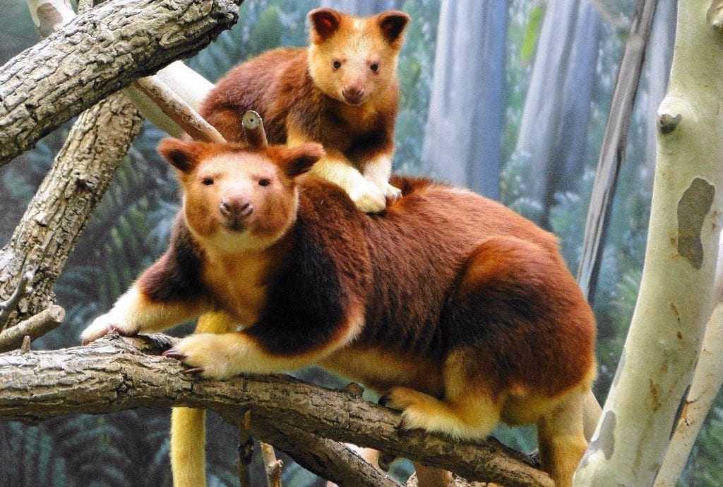 Это самый необычный подвид кенгуру, который отличается от остальных соплеменников не только внешним видом, но и образом жизни. Длина их тела варьируется в пределах 50-80 см, а весят они всего 5-18 кг. Окрас у древесных кенгуру темно-коричневый с медным отливом, шерсть на нижней части туловища белая или светло-бежевая. У животных короткие задние ноги с широкими подошвами и длинными загнутыми когтями, благодаря чему они мастерски лазают по деревьям, где и проводят большую часть жизни. А еще у данного подвида укороченная мордочка и небольшие округлые ушки, и в отличие от обычных кенгуру, передвигаются они не в вертикальном, а горизонтальном положении. Обитают древесные кенгуру в северно-восточной части штата Квинсленд, во влажных тропических лесах Папуа-Новой Гвинее и на полуострове Кейп-Йорк.