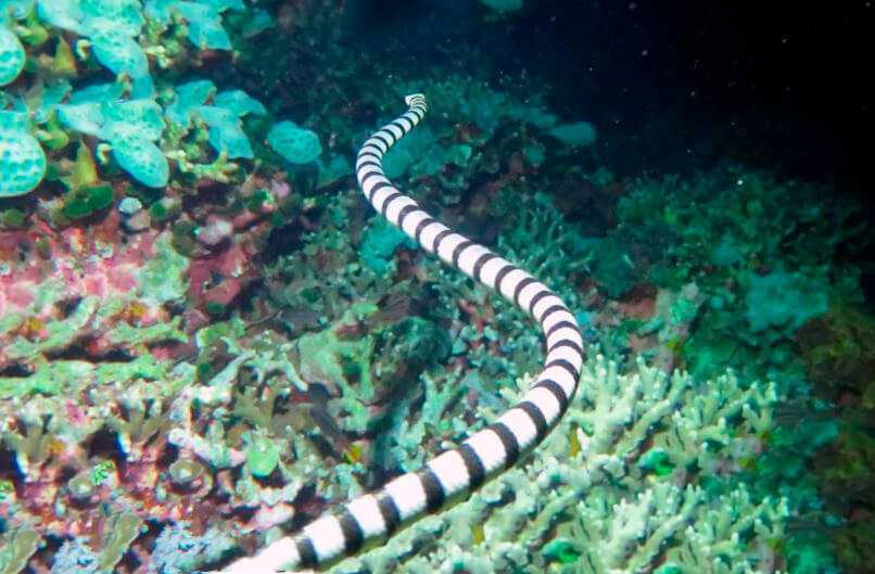 Попав на нерестилище, он никогда не упустит случая вдоволь полакомиться рыбьей икрой. Яд морских змей относится к сильным нейротоксинам и, попав в организм, мгновенно убивает пойманную добычу. Это относится, в том числе и к угрям, к которым рептилия испытывает особое пристрастие.