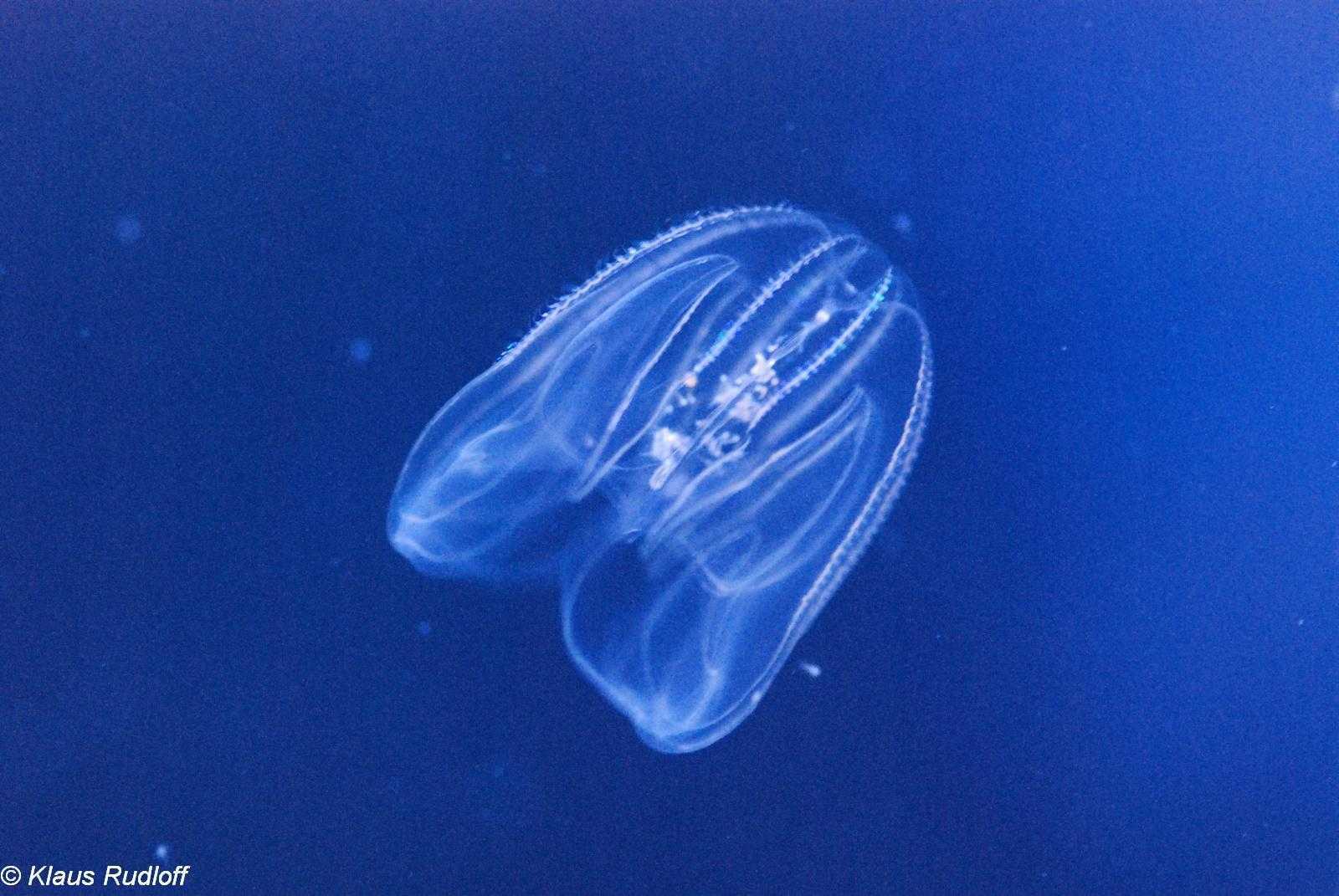 Мнемиопсис — медуза, которая не имеет щупалец и жал. Вдлину достигает 10 см, в ширину 6 см. Этот организм имеет свойства биолюминесценции — способности светиться.