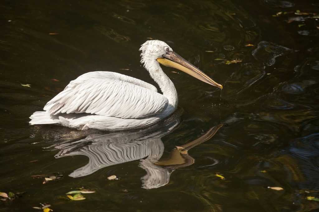 Кудрявый пеликан с пойманной рыбой в клюве, зоопарк Герберштайн, Австрия.