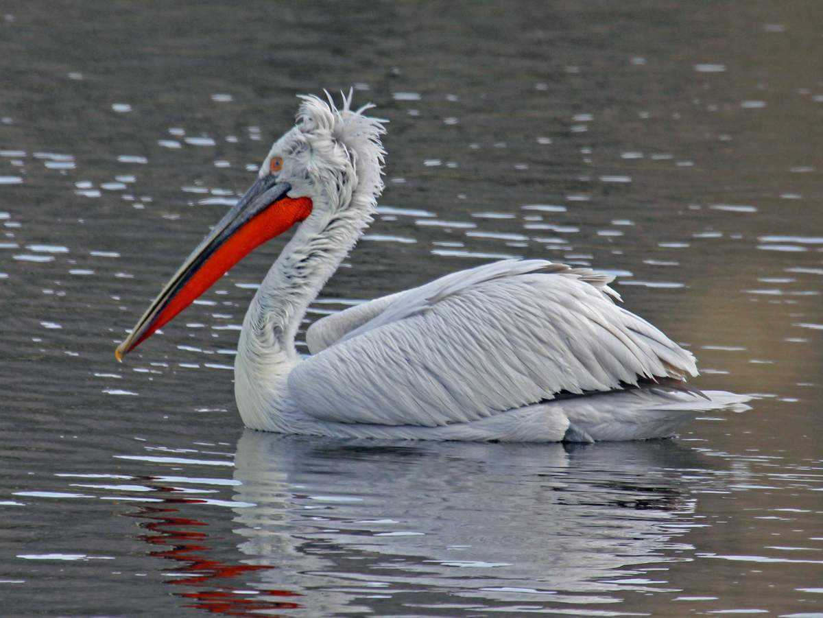 Птица кудрявый пеликан отличается от вышеупомянутого вида тем, что у него длинные перья на затылке, белое оперение, а также серые лапы.