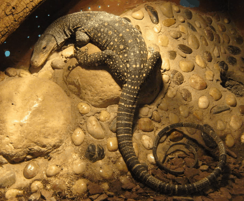 По размерам этот тип схож с предыдущим – длина туловища примерно достигает 2-2,5 метра. Полосатого варана не зря называют водным – он долгое время может спать в воде. Но и хорошо забирается на любые деревья и роет себе норы глубиной около 10 метров.